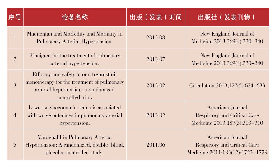 (5) 牵头完成了波生坦、吸入伊洛前列素、西地那非、安立生坦等药物治疗肺动脉高压的疗效和安全性研究,建立了标准的靶向治疗肺高压体系,显著改善我国肺高压患者的长期预后;