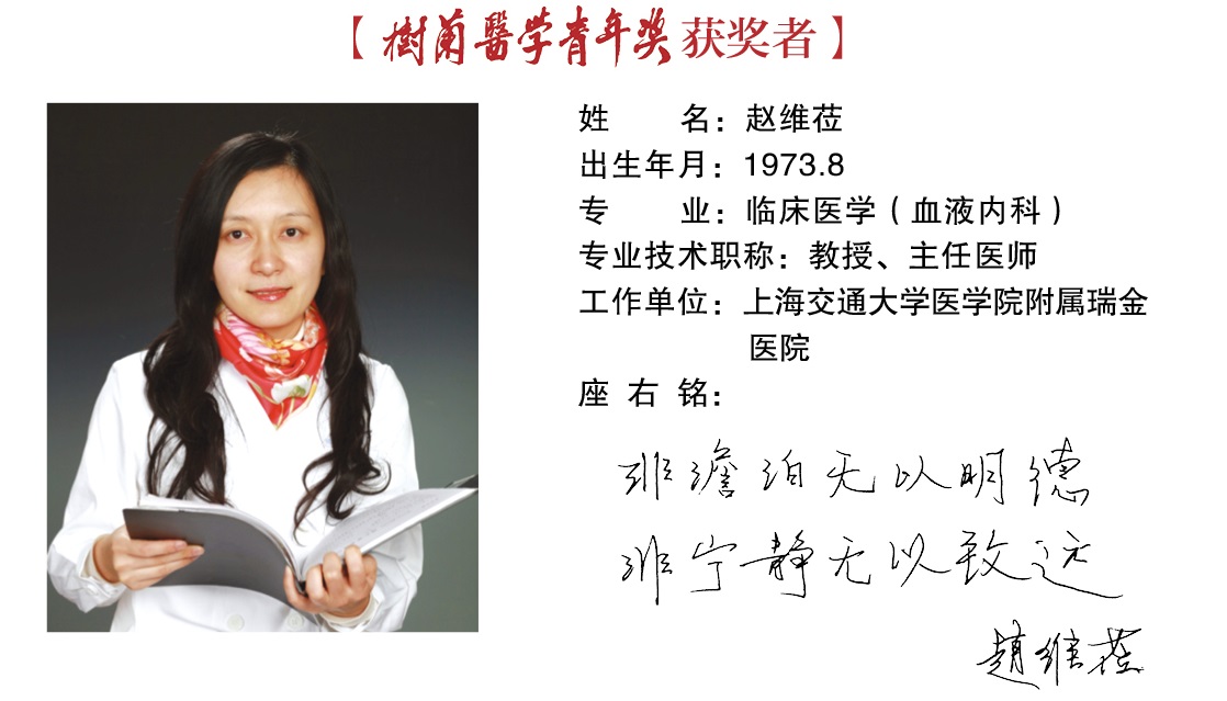 赵维莅(1973.8.4- ),血液学专家,上海市生人。1998年毕业于上海第二医科大学临床医学专业,2005年获得法国巴黎第七大学血液学博士学位。现担任上海血液学研究所副所长,主任医师,上海交通大学特聘教授,博士生导师。主要从事淋巴细胞恶性疾病的基础和临床研究。入选“教育部长江学者”、“教育部新世纪优秀人才”、“国家杰出青年科学基金”、“国家百千万人才工程”、“全国卫生系统先进工作者”、“上海市领军人才”和“上海市优秀学术带头人”。