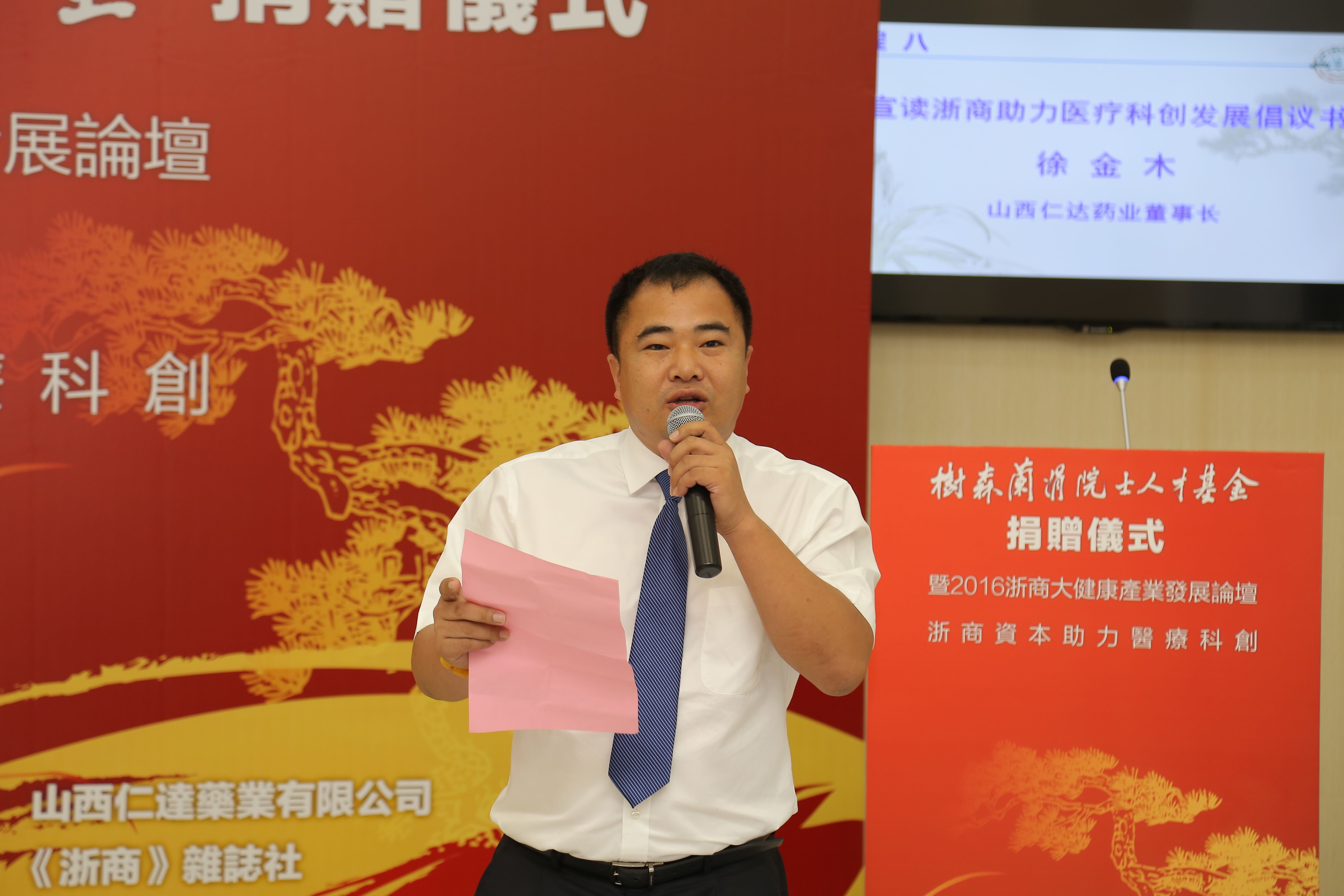 “我们向天下浙商倡议:积极参与提升中国医疗行业的产能,助力中国医疗科创的发展和人才培养;让我们一起努力,全力支持中国构建健康未来!”在7月26日下午举行的“树森·兰娟院士人才基金捐赠仪式暨2016浙商大健康产业发展论坛”上,浙商代表——山西仁达药业董事长徐金木先生向“树森·兰娟院士人才基金”进行了捐赠,并宣读《浙商助力医疗科创发展倡议书》,“希望让浙商成为一个最富有社会责任感的商人群体,不断为中国人民的健康福祉和世界人民的健康福祉做出我们应有的贡献!”