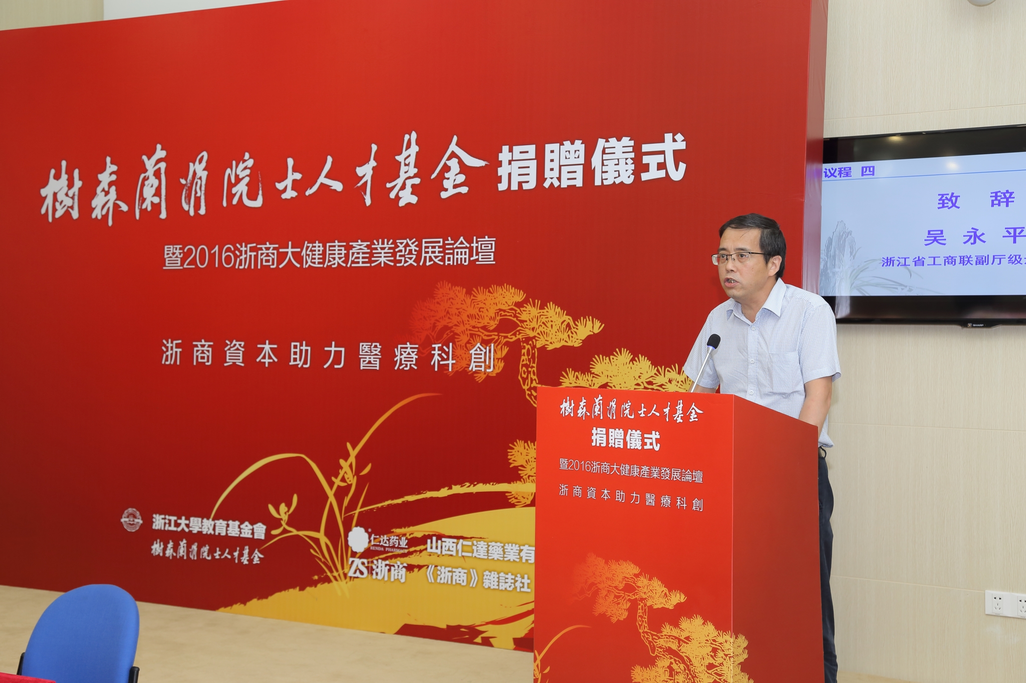 浙江省工商联吴永平副巡视员在致辞中表示:浙商正在践行习总书记关于“促进非公有制经济健康发展和非公有制经济人士健康成长”的要求,浙商正在成长成为有责任有贡献的一代,而大健康产业是我省重点打造的七大“万亿”产业之一,省外浙商回归浙江,参与省内的基金合作、人才培养、科技创新就是一种很好的形式和途径,希望更多浙商回到家乡、反哺浙江,为浙江的大众创业、万众创新添砖加瓦。