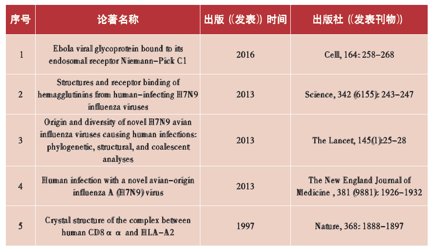 其领导的研究组在流感病毒流行病学、跨种传播分子机制研究领域建树颇多,首次证实野生迁徙鸟能够群体感染高致病性H5N1禽流感病毒,改变了野生迁徙鸟只是流感病毒贮存宿主的结论;发现H7N9禽流感病毒是一种新型的重配病毒,与长江三角地区迁徙鸟和家禽有关,呼吁关闭活禽市场以预防病毒的进一步传播和可能的全球大流行,为国家制定禽流感防控政策提供了重要基础。率领首批中国疾病预防控制中心移动实验室检测队赴塞拉利昂抗击埃博拉,描绘出埃博拉病毒的进化图,在抗击埃博拉病毒的国际援助行动中发挥了关键作用。对流感病毒、埃博拉、MERS-CoV和寨卡等多种囊膜病毒的入侵机制进行研究,阐明其分子机制,并研发抗体、药物等抗病毒手段,为新发突发传染病防控提供重要支撑。是病原微生物与免疫领域的领军人物。