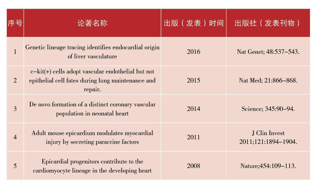上述研究成果为进一步揭示细胞在组织器官发育与再生过程中的起源及命运提供了新的视角和思路,并推广了示踪技术在发育生物学和再生医学的应用。作为第一或通讯作者发表SCI论文30余篇,包括Nature、Science、Nat Genet、Nat Med、Circ Res (4篇)、Cell Res (3篇)、J Clin Invest(2篇)、Nat Commun(2篇)等,并多次在国际学术会议上做大会报告。获得“国家杰出青年科学基金”、中组部万人计划“青年拔尖人才”及科技部“中青年科技创新领军人才”等人才奖项。