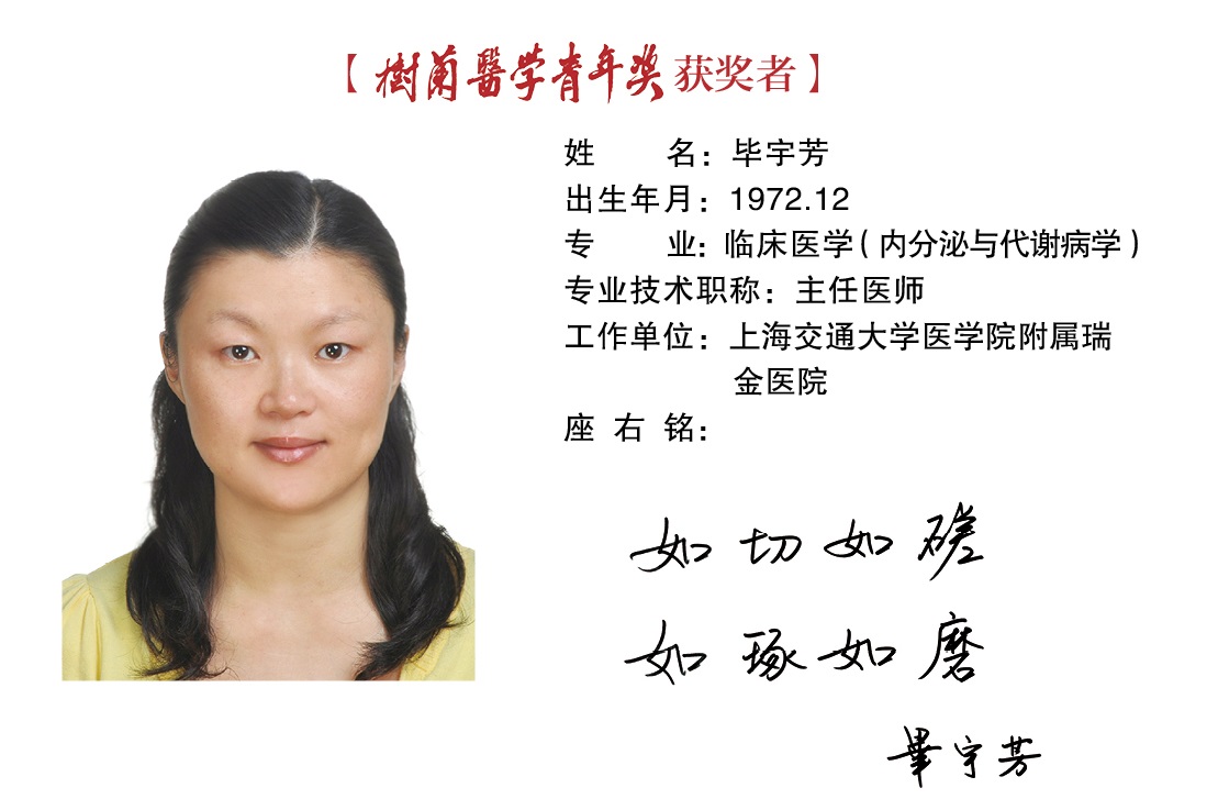 毕宇芳(1972.12.31 —),医学博士,内分泌代谢病学领域青年学者,国家自然科学优秀青年基金获得者,上海市领军人才。现任上海市内分泌代谢病研究所副所长、上海交通大学医学院附属瑞金医院内分泌代谢病科主任医师。兼任中华医学会内分泌学分会委员与中华预防医学会慢病防控分会青年委员会副主任委员、SCI收录杂志《Journal of Diabetes》编委。长期致力于2型糖尿病的危险因素与早期防控研究,作为项目负责人先后承担各类科研项目11项,包括科技部重大研发计划1项、国家自然科学基金4项,研究成果以第一或通讯作者发表SCI收录论著38篇。