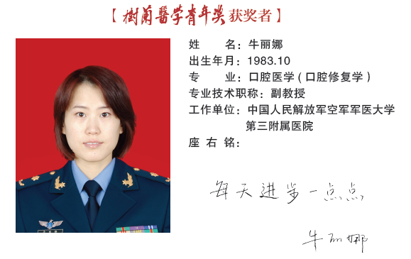 牛丽娜是我国口腔修复学专家,围绕仿生矿化技术用于硬组织缺损修复的问题,在仿生矿化材料构建、矿化机制探索及其在硬组织再生修复中的应用取得了突出成果。2018年获批中华口腔医学会科技进步一等奖1项,陕西省科技进步一等奖1项(公示中)。2017年获批国科金优青项目,教育部青年长江学者奖励计划、陕西省青年拔尖人才、中青年科技创新领军人才。2016年获中华口腔医学会科技创新人物称号、中国人民解放军三等功。2015年获世界华人口腔医学会杰出青年科学家、陕西省科技新星。2013年获世界牙科研究协会Toshio Nakao奖(迄今为止亚洲唯一获得者)。目前兼任中华医学会组织修复与再生分会委员、中国生物材料学会骨修复材料与器械分会口腔生物材料及应用专委会委员、陕西省口腔医学会口腔修复学专业委员会委员等职。主要学术成就和贡献如下: