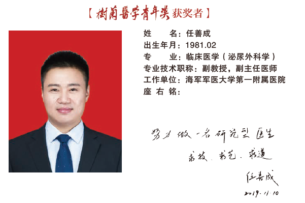 我是任善成,来自海军军医大学附属长海医院泌尿外科。非常荣幸获得第六届树兰医学青年奖。