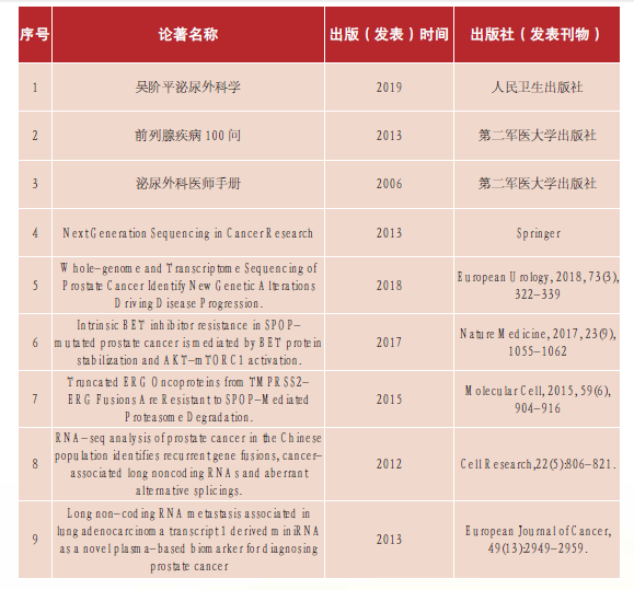 目前我以第一或通讯作者发表SCI论文35篇,他引1600余次,其中影响因子大于30的有1篇,大于10的有6篇,总影响因子202.98,3篇被评为ESI高被引论文(引用率居于生命科学领域被引频次在世界前1%的论文)。申请国家发明专利15项,获批8项,申请国际发明专利(PCT)2项。参与编写教材《吴阶平泌尿外科学》《泌尿外科医师手册》《前列腺疾病100问》《Next Generation Sequencing in Cancer Research》等部分章节。