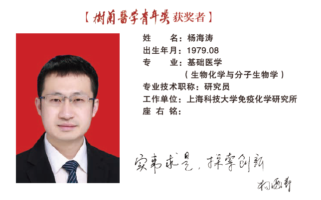 杨海涛(1979.08.05 — ),长期从事病原微生物与抗感染药物研究。生于重庆市。2006年毕业于清华大学生物学专业。现为上海科技大学免疫化学研究所研究员;目前担任国家重点研发计划重点专项总体专家组专家、法国国家科研署和波兰国家科学基金外审专家、国家“重大新药创制”科技重大专项评审专家、长江学者奖励计划评审专家、“973”计划青年项目首席科学家,曾入选国家“青年千人计划”;在结核分枝杆菌、寨卡病毒、SARS病毒和HIV病毒的结构与功能以及抗感染药物研究中取得了多项重要成果,已发表SCI论文50余篇,申请专利20余项;曾获中国产学研合作促进奖、中国侨界贡献奖和科学中国人年度人物等荣誉。