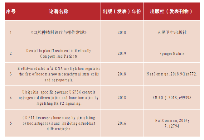 以“牙种植体骨结合的调控机制与转化”为研究方向,重点研究系统疾病对牙种植体骨结合的影响,显著提高牙种植治疗的临床效果和长期稳定。2013年入选教育部新世纪优秀人才和四川省杰出青年人才,2016年入选四川省卫健委学术带头人,2017年入选“万人计划”科技创新领军人才,同年入选“长江学者计划”青年学者,并获得国家优秀青年基金资助。2018年获四川省青年科技奖,2019年获教育部科技进步一等奖(第二完成人)。现任中国医师协会口腔分会口腔种植工作委员会副主任委员,中华口腔医学会口腔种植专委会常务委员和四川省口腔医学会口腔种植专委会候任主任委员。主参编《口腔种植科诊疗与操作常规》和《Dental Implant Treatment in Medically Compromised Patients》等专著/教材8部,担任人卫社《口腔种植学》慕课第一主讲人。主要学术成绩如下: