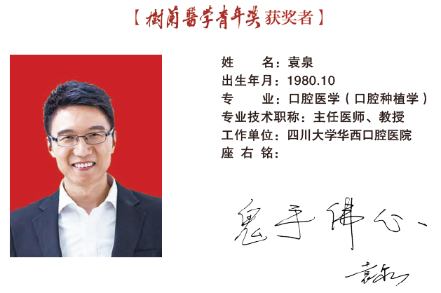 袁泉,生于重庆市。2008年毕业于四川大学,获口腔临床医学博士学位。现任四川大学华西口腔医院主任医师、教授、博士生导师。先后留学日本广岛大学,美国哈佛大学和加州大学洛杉矶分校。入选“万人计划”领军人才和青年长江学者,并获国家优秀青年基金资助。担任中国医师协会口腔医师分会口腔种植工作委员会副主任委员,中华口腔医学会口腔种植专业委员会常务委员和四川省口腔医学会口腔种植专业委员会候任主任委员。以“牙种植体骨结合的调控机制与转化”为研究方向,显著提高牙种植治疗的临床效果和长期稳定。以第一和通讯作者身份在Nat Communn、PNAS、EMBO J和JBMR等杂志发表SCI论文40余篇,主参编教材/专著8部,获教育部科技进步一等奖(排名第二)。