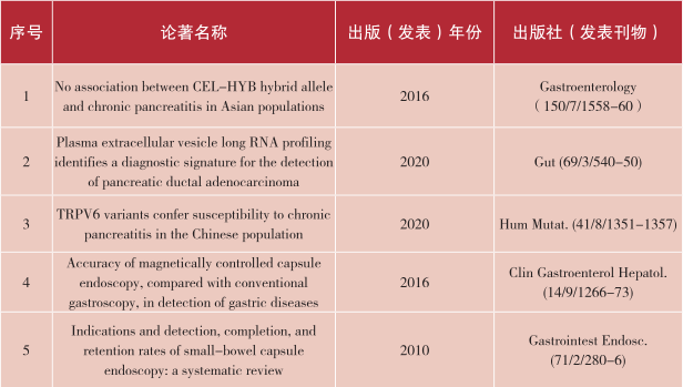 廖专教授是我国胶囊内镜及慢性胰腺炎研究领域的中青年领军人才,先后入选国家万人计划、科技部中青年科技创新领军人才、国家优青、教育部青年长江学者等人才计划,兼任中华消化内镜学会委员及胶囊内镜协作组组长、中国医师协会胰腺病学专委会常委及慢性胰腺炎学组主委、上海市消化内镜学会副主委等学术职务。主要科技成就如下:一、磁控胶囊胃镜系统研发与临床应用研究医工结合研制成功世界首个机器臂式磁控胶囊胃镜系统,率先制定标准操作流程和检查方法,实现了完全无痛、准确、简便的胶囊胃镜检查,在国内外近千家单位应用超过70余万例,获批专利7项,先后入选国家“十二五”科技创新成就展、2016中国十大医学进展、十九大“砥砺奋进的五年”成就展与2018科技部创新医疗器械产品。2020年该系统正式获美国FDA批准,成为全球首个获批的磁控胶囊胃镜系统。二、消化疑难病慢性胰腺炎的微创治疗及致病机制研究构建大宗临床研究队列,系统阐明中国病人特有临床特征,率先开展体外震波碎石和内镜微创系统治疗,提出MEES升阶梯治疗新模式,显著提高了微创治疗成功率和临床有效率,明显改善患者症状和生活质量,使所在单位成为全国微创治疗中心,同时还发现汉族人多个相关易感基因及位点并阐明其机制,为精准治疗奠定基础。主持基金课题20余项,累计经费3000余万,在国内外期刊共发表论文200余篇,获发明专利10项,实用新型22项,外观1项,获国家科技进步二等奖(2次)、上海市科技进步一等奖、上海市银蛇奖一等奖等。