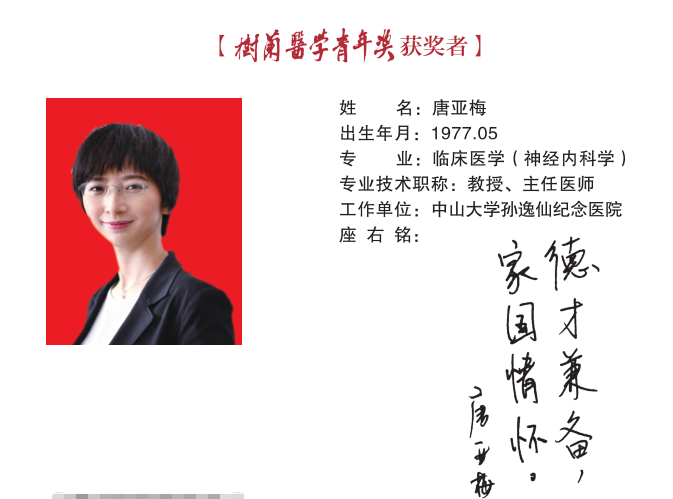 唐亚梅教授是我国知名神经病学专家,长期从事放射性神经损伤系统研究并优化临床诊疗方案,促进我国放射性神经损伤学科系统建设及多中心临床合作,对解决放射性神经损伤发病机制不明、治疗手段有限等重大科学问题做出了突出贡献,提高了我国理化因素所致神经系统损伤的临床诊治水平。成果被4部国际权威指南共同推荐采纳;牵头制定《放射性脑损伤诊治中国专家共识》。2019年获国家杰出青年科学基金,2016年获国家优秀青年科学基金。入选首届中国十大杰出青年神经内科医师,教育部新世纪优秀人才。以通讯/第一作者发表SCI论文37篇,含IF>10分4篇,IF>5分10篇,单篇最高IF 32.96,单篇最高他引159次,入选ESI高被引论文;获专利3项;主要学术成就和贡献如下:1.阐明放射后小胶质细胞活化释放炎性递质介导放射性神经损伤新机制,并证实普瑞巴林可显著改善炎性相关放射痛,突破了国际放射性神经痛的治疗瓶颈。2.阐明了放射后炎性物质清除障碍诱导损伤持续加重的新机制,首次提出促进炎性物质清除以重塑微环境稳态的新策略,成果直接推动国际指南修订。3.证实放射后血脑屏障受损是引起炎症持续进展至非可控的关键因素,采用针对屏障损伤的贝伐单抗显著提升脑损伤治疗有效率。