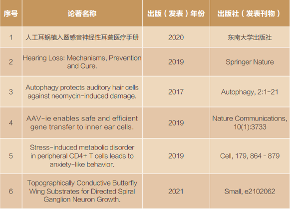 近 5 年在 Cell 等期刊发表通讯作者论文 88 篇, 包 括 IF>30 分 2 篇,IF10-30分 17 篇;4 篇论文被 F1000 列为推荐文章。发表在 Cell 上的工作入选科技部遴选的年度“中国科学十大进展”前 30 项候选进展;被 CELL 评为年度最佳论文,是 9 篇最佳论文中唯一完全由中国学者完成的工作。作为主编出版 2 本耳科学教材和一本英文专著,也获得江苏省青年科技奖暨江苏省青年十大科技之星,教育部自然科学一等奖(第三),江苏省医学科技奖一等奖(第二),江苏省科技进步奖三等奖(第二),上海市技术发明一等奖(第九);申报 18项国家发明专利,授权 2 项。