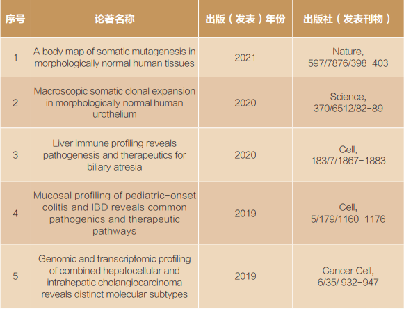 2)与合作团队应用单细胞转录组测序及免疫分型技术:揭示肠黏膜多个细胞类群中的 cAMP 通路被抑制导致的级联免疫紊乱是儿童炎症性肠病的重要致病机制,发现了双嘧达莫“老药新用”治疗儿童炎症性肠病的重要价值(Cell, 2019, 中国临床医学十大进展);系统描绘了胆道闭锁患儿肝脏免疫图谱,提出 B 细胞耐受缺陷、杀伤性 T 细胞扩增等因素共同促进了儿童胆道闭锁的发病,首创了 B 细胞修饰疗法(利妥昔单抗)应用于婴幼儿胆道闭锁治疗,具有重要的临床意义(Cell, 2020)。