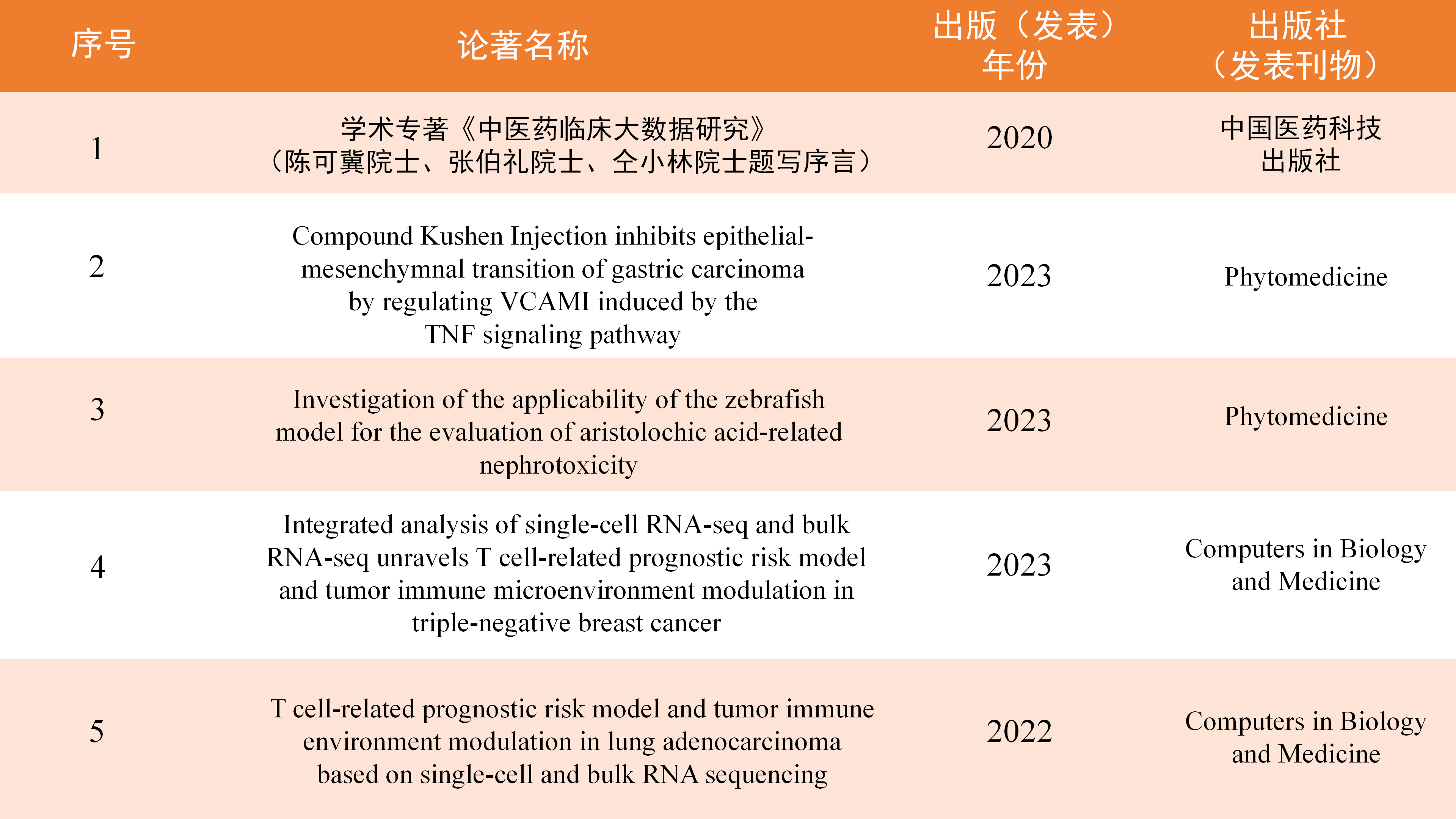 4. 著作情况:主编学术著作 7 部,包括《中医药临床大数据研究》《中药注射剂临床应用系统评价研究》《国医大师颜正华孟河京派学术思想传承全集》《中药注射剂不良反应与安全应用》等,累计超过 300 万字。