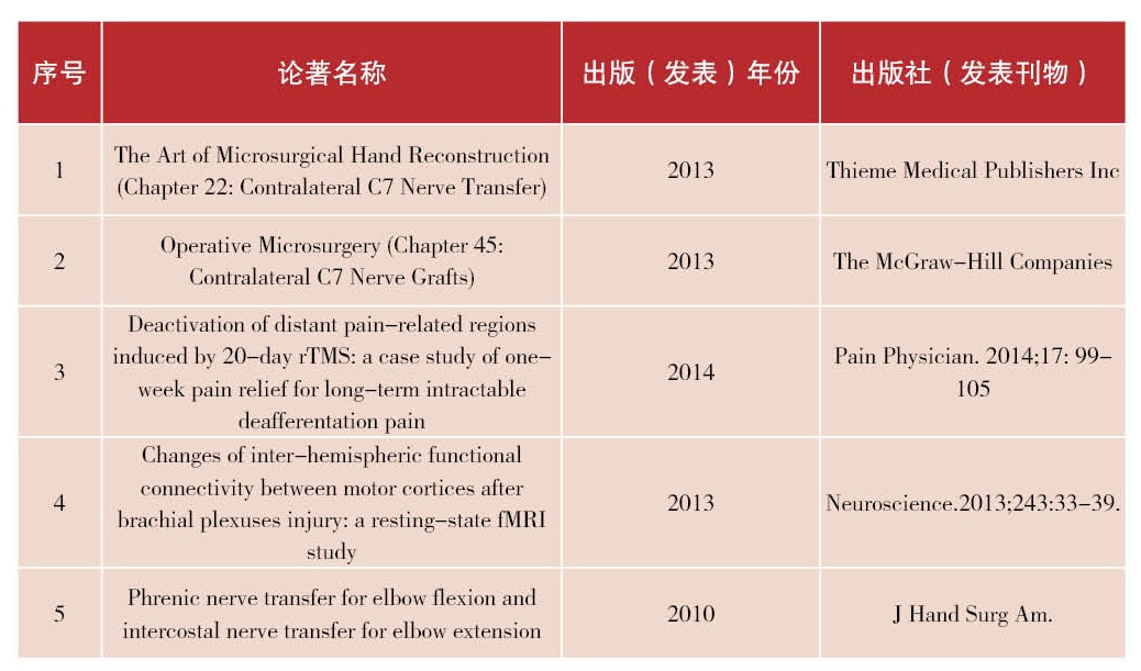 主要学术成就和贡献包括:一、在外科手术改变周围神经通路诱导大脑发生功能重组变化的系列研究基础上,提出“改变外周影响中枢”的全新治疗理念;二、提出周围神经移位治疗中枢损伤后遗症的全新策略;三、首创多项临床微创治疗方法,建立胸腔镜下全长膈神经移位术恢复臂丛损伤后上肢瘫痪的新术式;四、提出了臂丛神经损伤后难治性神经病理痛治疗的新策略。